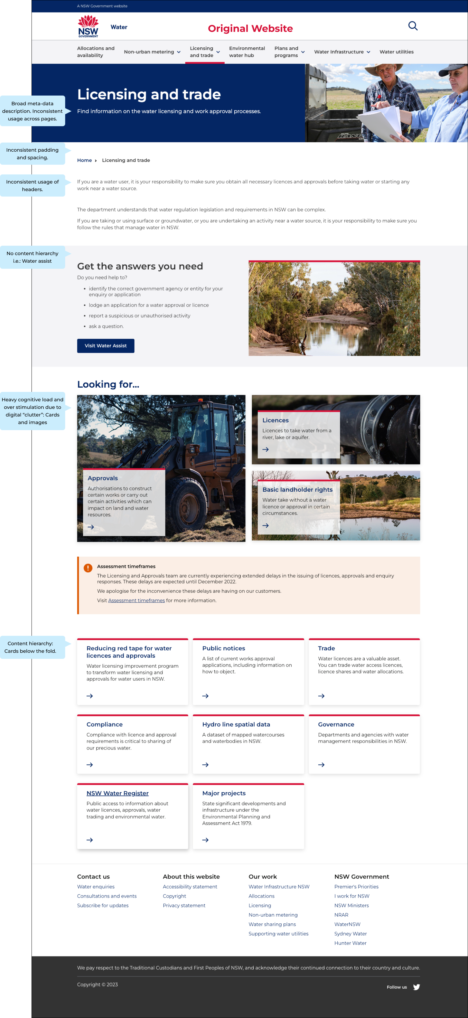 The Water NSW website felt like a relic—an outdated, maze-like experience that lacked any real consideration for the user. Its Information Architecture (IA), inherited from a previous vendor, resembled a chaotic patchwork more than a coherent navigation system, while the content read more like an academic journal than public-facing communication. The result? A high-stakes, high-friction experience.